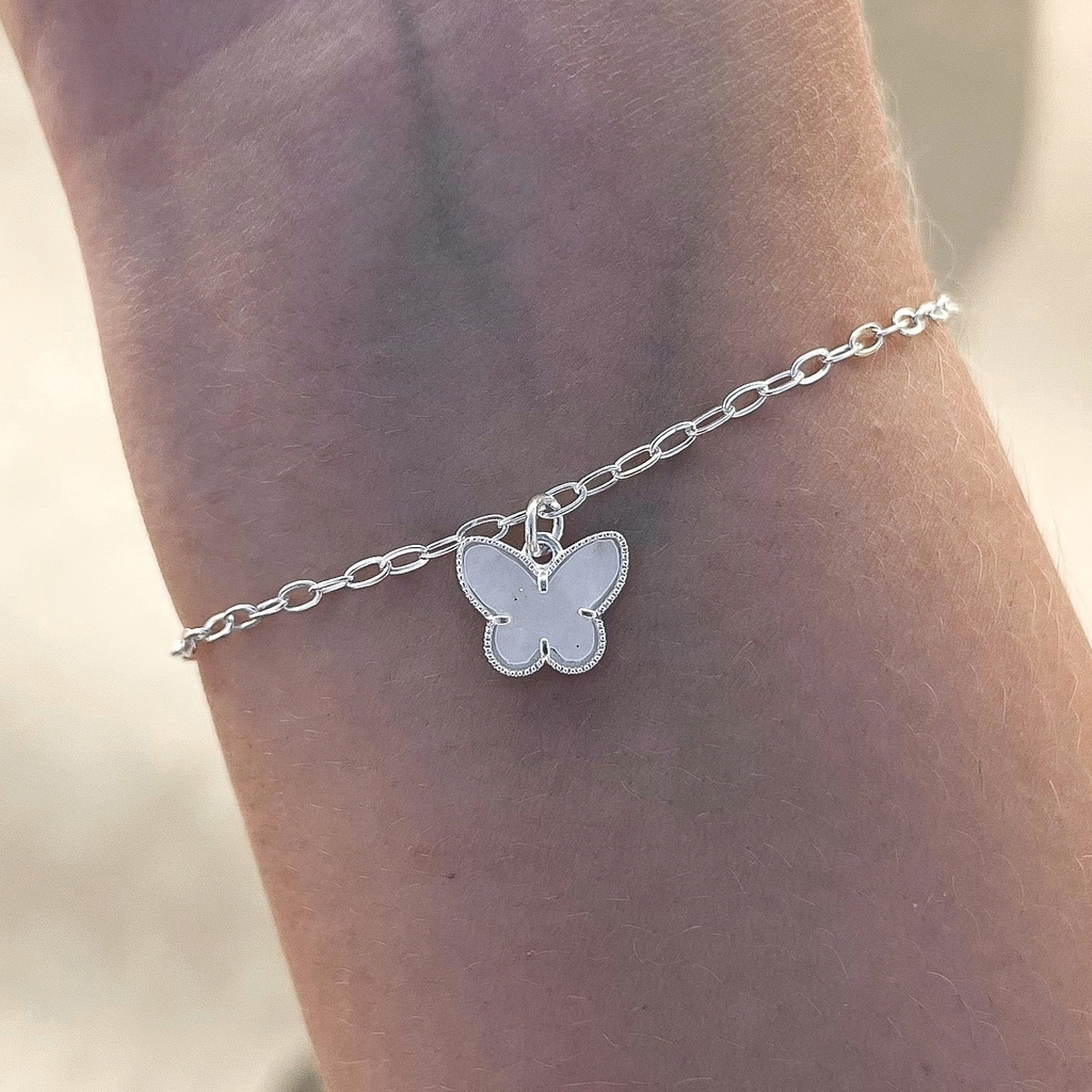 A Pulseira Prata Borboleta Celestial é uma joia que traduz leveza e espiritualidade em forma de borboleta. Com uma pedra única de madrepérola esculpida em formato de borboleta no centro, a peça simboliza renascimento, esperança e liberdade. Seu brilho cintilante entrega charme e encanto ao visual.